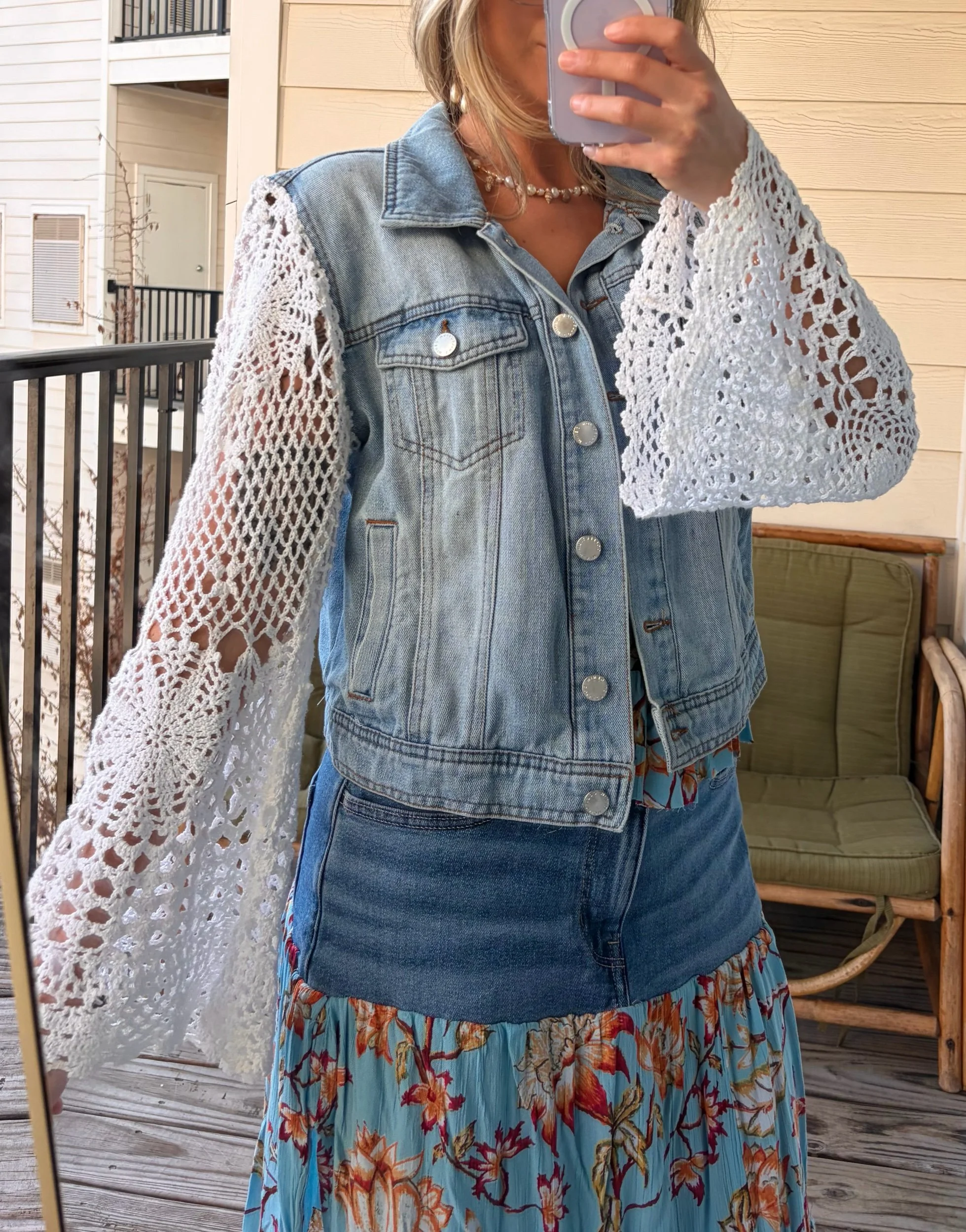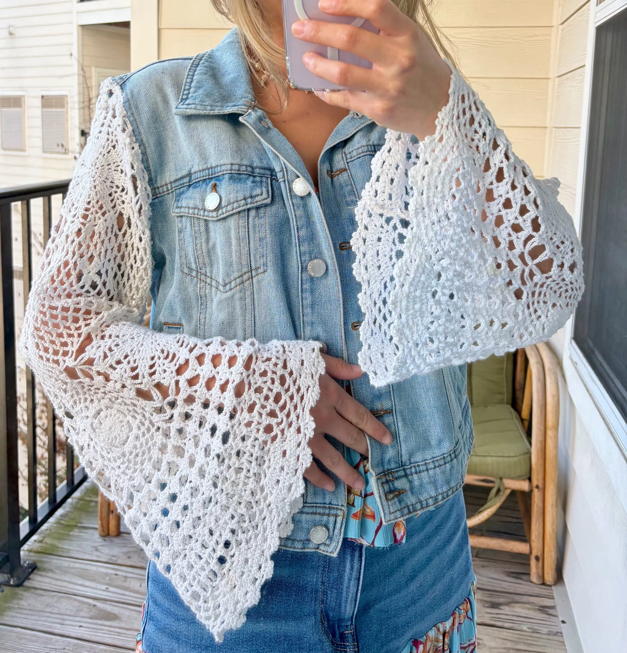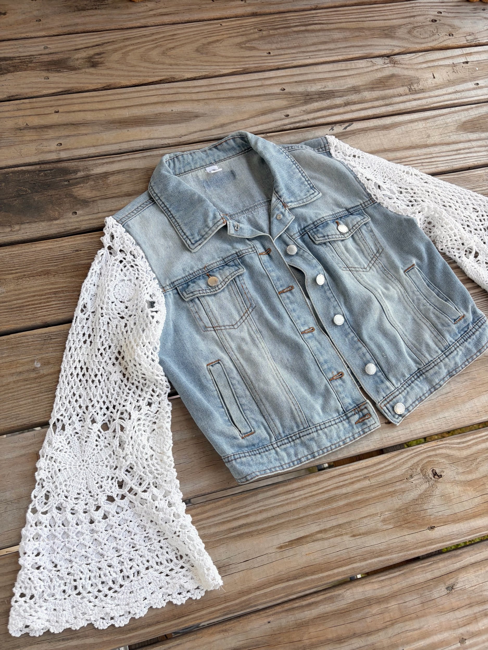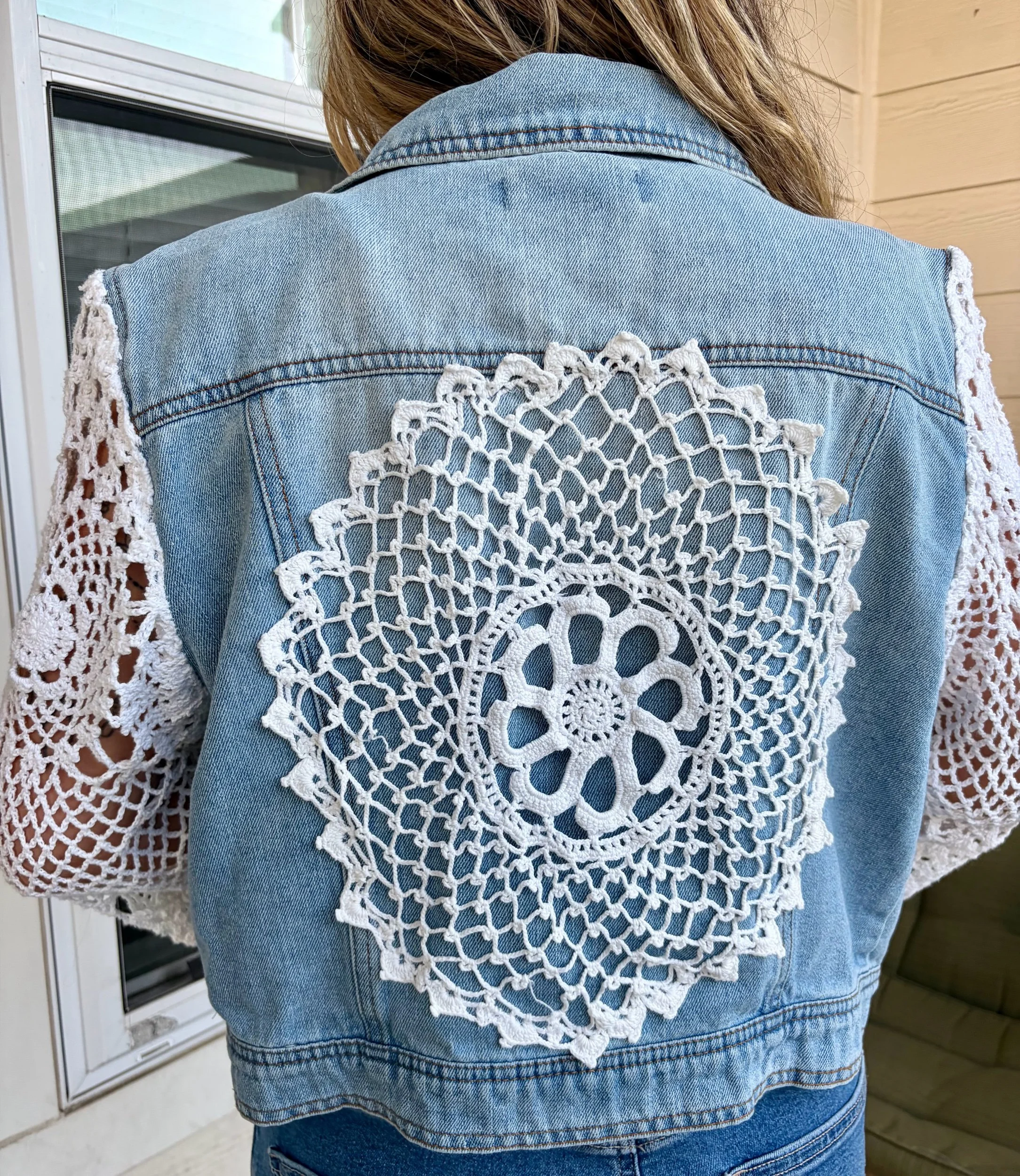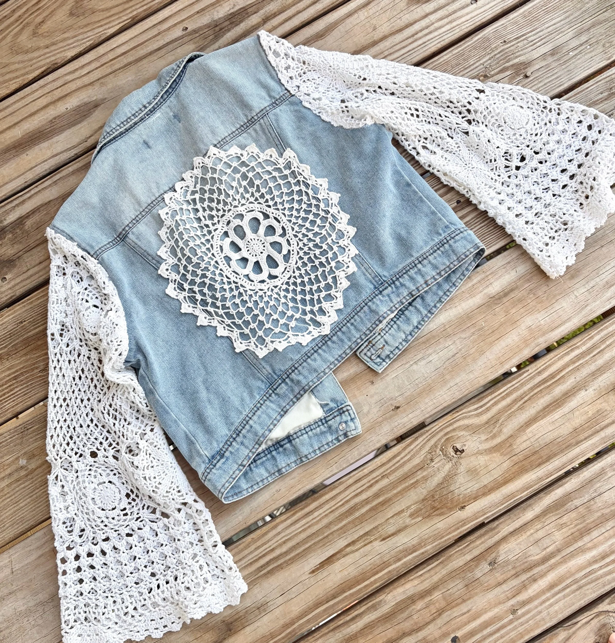 shop › doily dream jacket ☁️ Image 1 of 5 Image 2 of 5 Image 3 of 5 Image 4 of 5 Image 5 of 5 doily dream jacket ☁️ $130.00 repurposed a vintage crocheted tablecloth and doily to make the perfect warm weather jean jacket 🤍fits small to medium Add To Cart Added! repurposed a vintage crocheted tablecloth and doily to make the perfect warm weather jean jacket 🤍fits small to medium