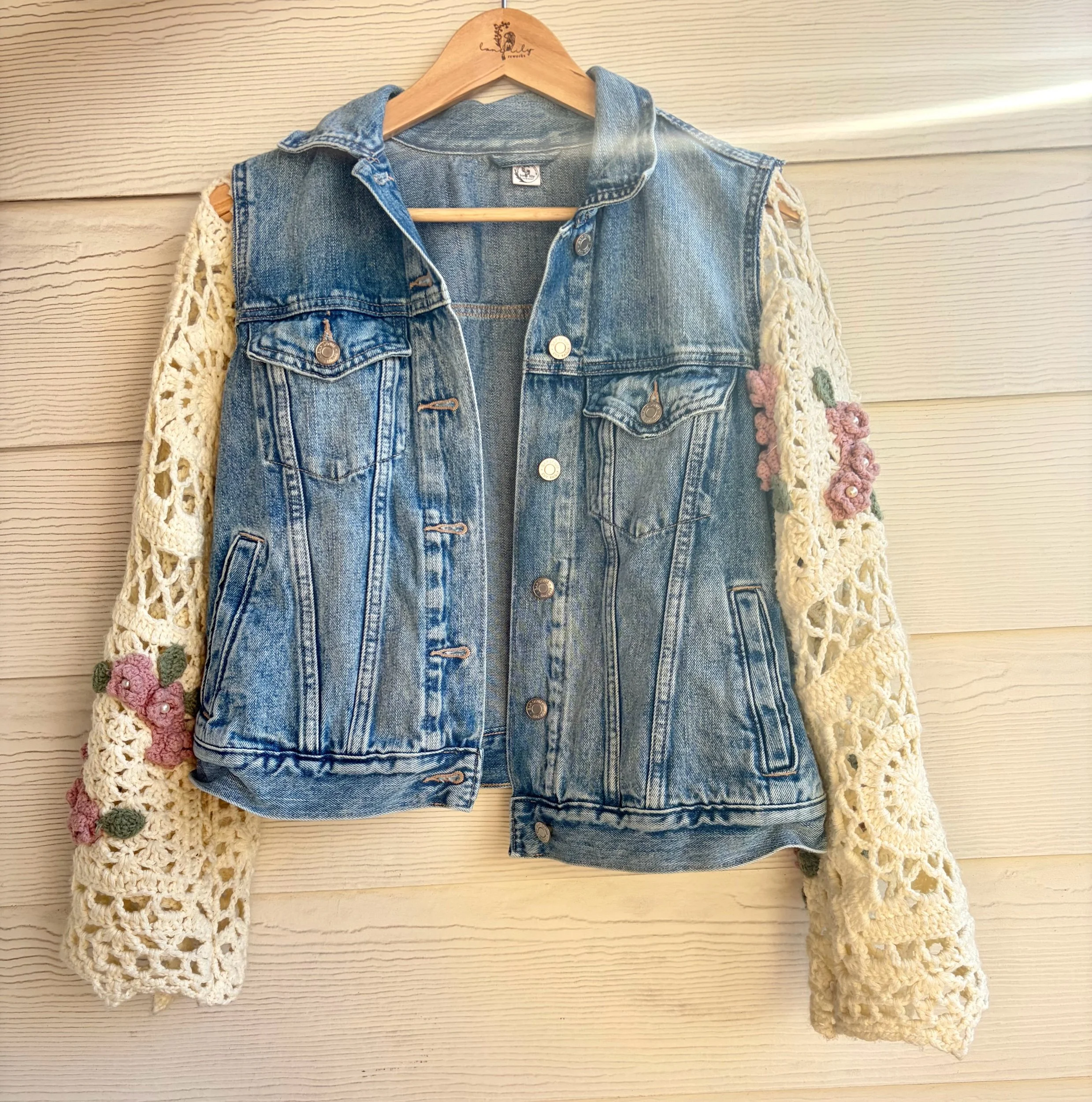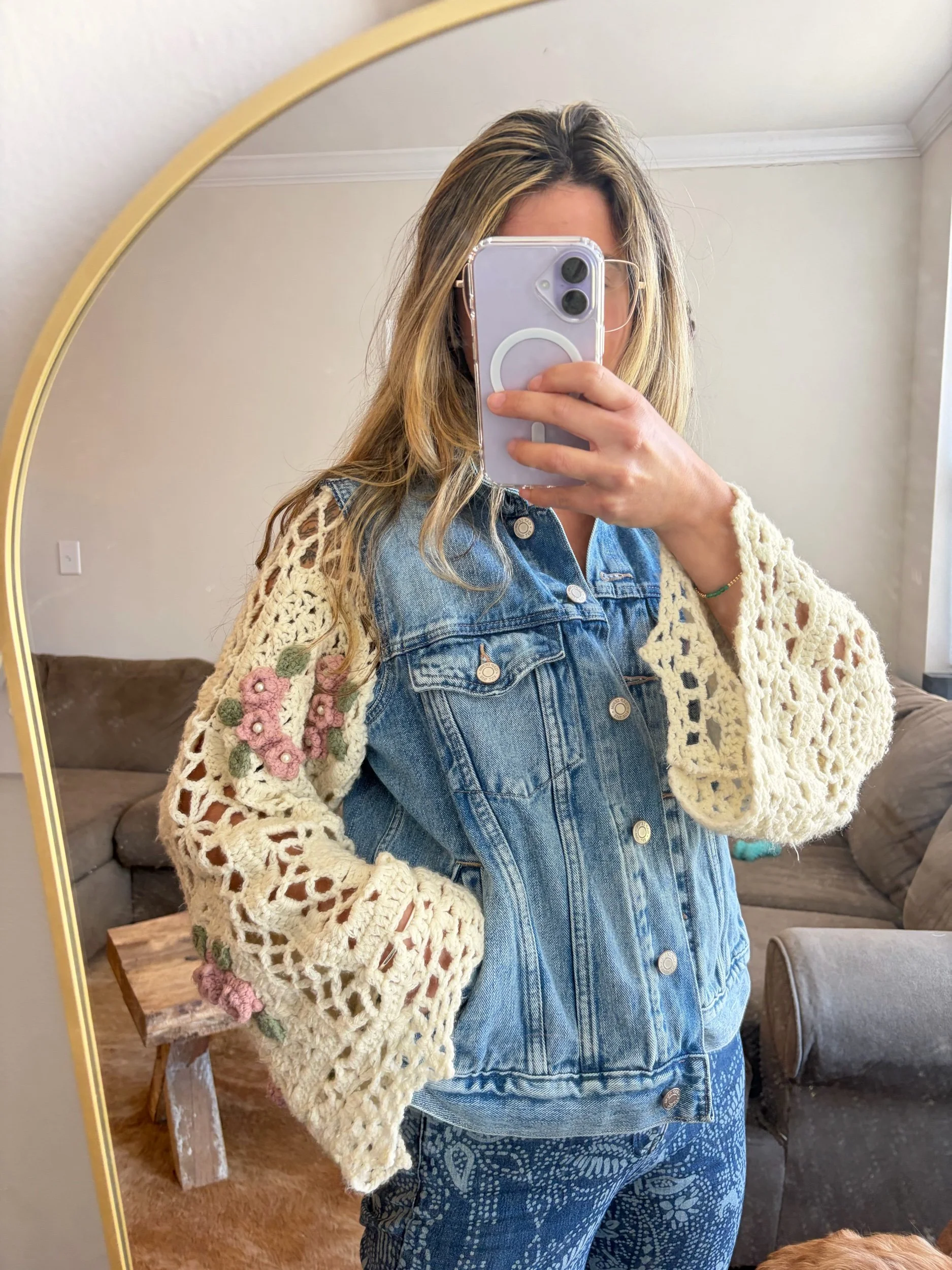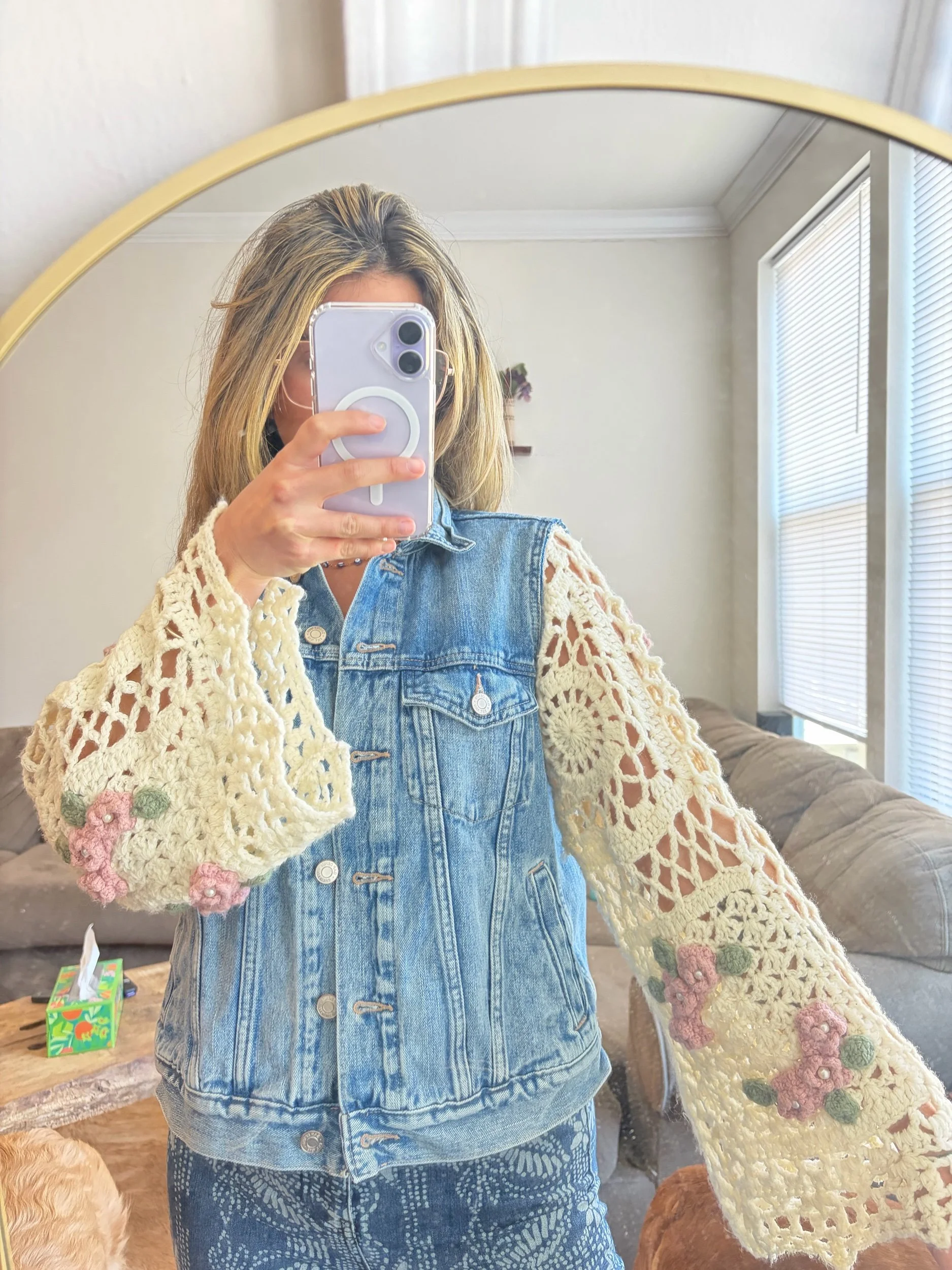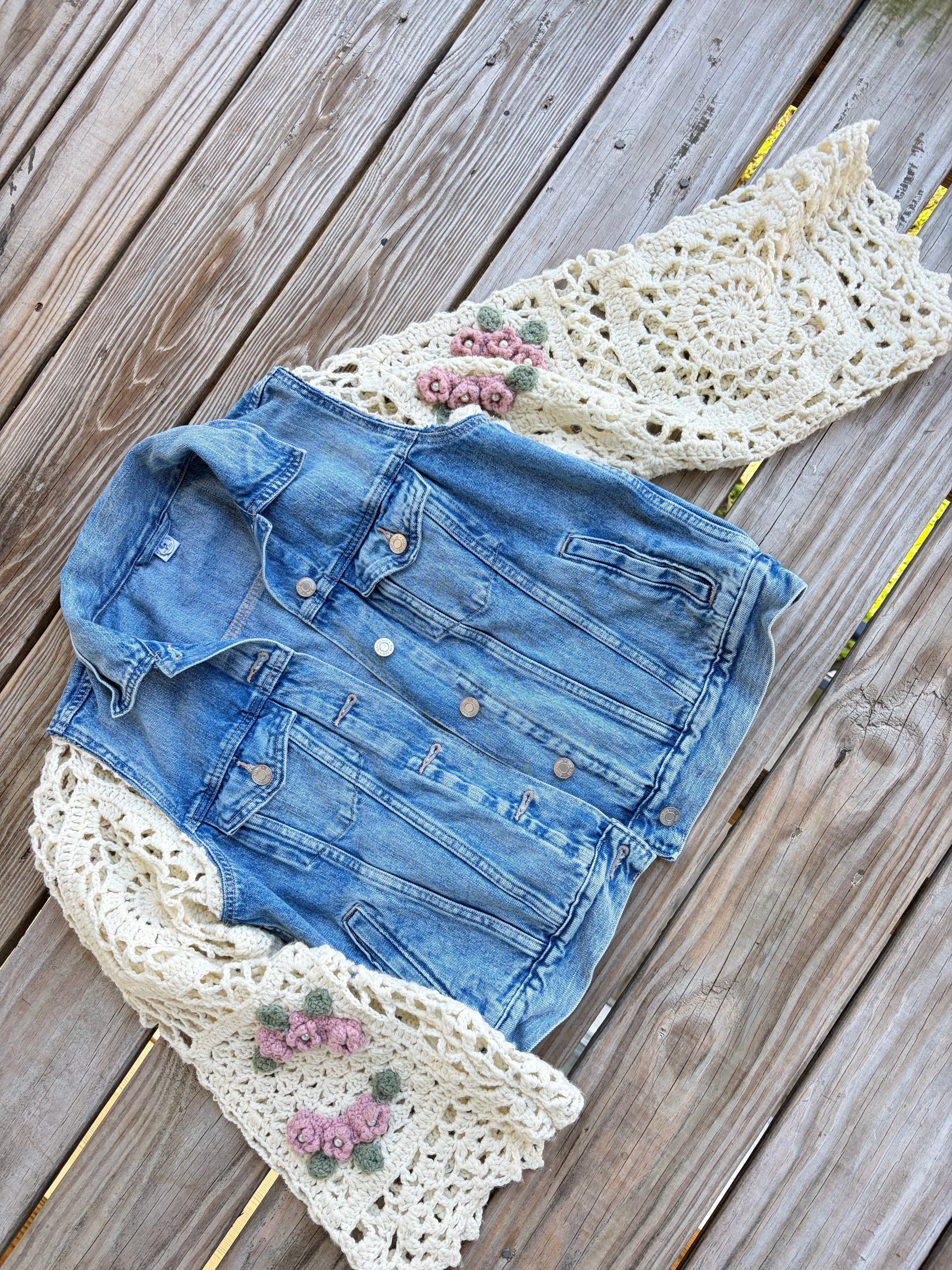 shop › budding pearls jacket 🌷 Image 1 of 5 Image 2 of 5 Image 3 of 5 Image 4 of 5 Image 5 of 5 budding pearls jacket 🌷 $160.00 reworked granny square blanket with crocheted flowers & pearl details to create sleeves on this jean jacket 🩷size medium Add To Cart Added! reworked granny square blanket with crocheted flowers & pearl details to create sleeves on this jean jacket 🩷size medium